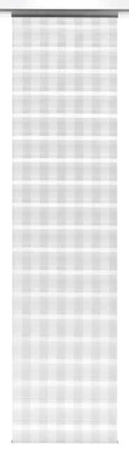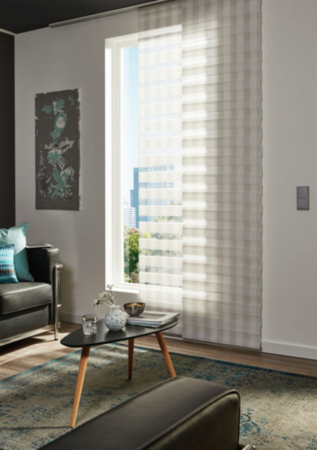 The panel curtain Day + Night is equipped with a high-quality aluminium profile, which can be hooked directly into any standard curtain rail without additional panel carriers. The fabric is 100% polyester and woven segmentally. Through an innovative and patented technology, the fabric is superimposed on itself, so that the light can be adjusted as needed. The panel curtain Day + Night can easily be shortened to the desired length.