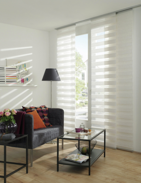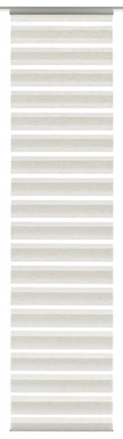 The panel curtain Day + Night is equipped with a high-quality aluminium profile, which can be hooked directly into any standard curtain rail without additional panel carriers. The fabric is 100% polyester and woven segmentally. Through an innovative and patented technology, the fabric is superimposed on itself, so that the light can be adjusted as needed. The panel curtain Day + Night can easily be shortened to the desired length.
