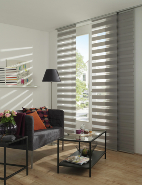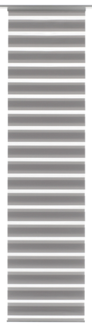 The panel curtain Day + Night is equipped with a high-quality aluminium profile, which can be hooked directly into any standard curtain rail without additional panel carriers. The fabric is 100% polyester and woven segmentally. Through an innovative and patented technology, the fabric is superimposed on itself, so that the light can be adjusted as needed. The panel curtain Day + Night can easily be shortened to the desired length.