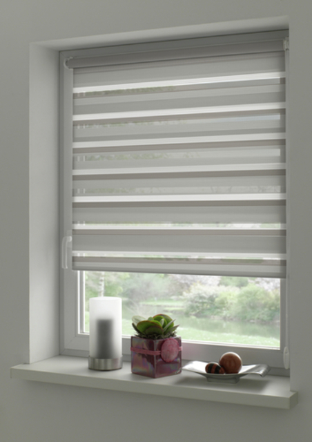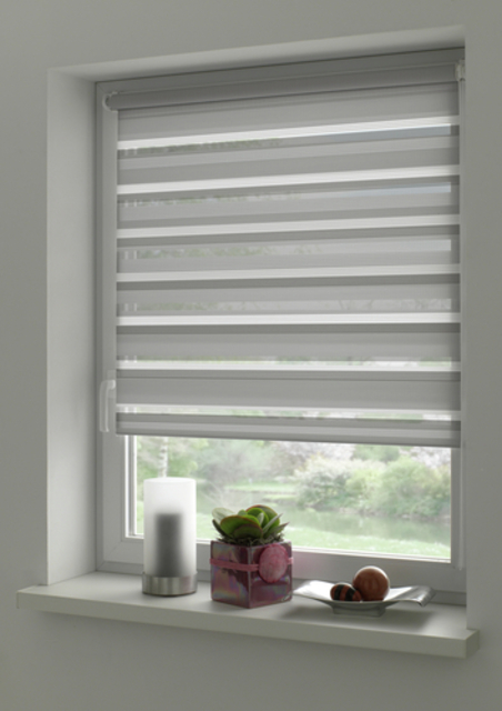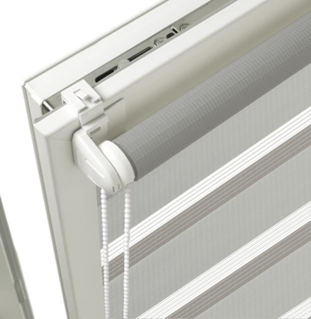 Das EASYFIX Doppelrollo lässt sich ohne Bohren und Schrauben am Fensterflügel befestigen. Die verstellbaren Klemmträger können für fast jeden Fensterflügel passend eingestellt und daran montiert werden. Eine Klebemontage ist ebenfalls möglich. Der Stoff ist abwechselnd in transparenten und blickdichten Streifen gewebt und verläuft doppelt gegeneinander. Sicht-und Lichteinfall können so sehr genau dosiert werden. Das EASYFIX Doppelrollo wird mittels einer Kette auf- und abgerollt. Die Kette kann rechts oder links montiert werden.