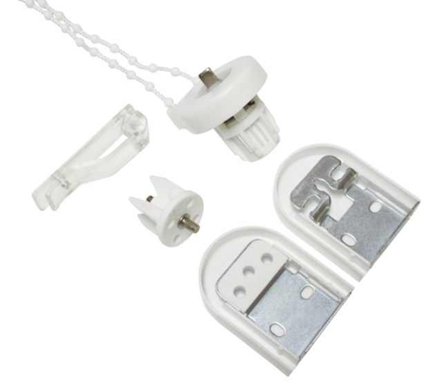 Kunststoff/Metall, Getriebe mit Kette 100 cm und Kettenhalter. Träger mit Dekokappen zur Decken-, Wand- oder Nischenmontage. Für Rollos mit Metallwelle Ø 25 mm bis zu einer Breite von 202 cm verwendbar
